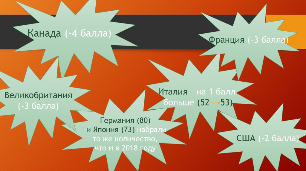 потеряли по два балла (56 и 30 баллов, соответственно); Молдова и Туркменистан — по