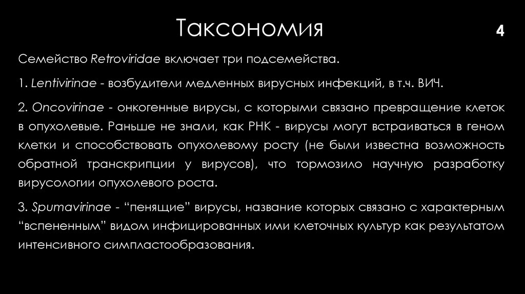 Семейство Retroviridae включает три подсемейства.