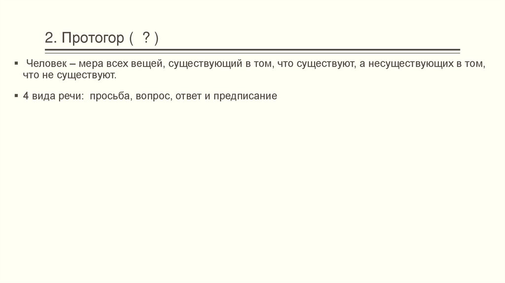 2. Протогор ( ? )Человек – мера всех вещей, существующий в том, что существуют, а несуществующих в том,