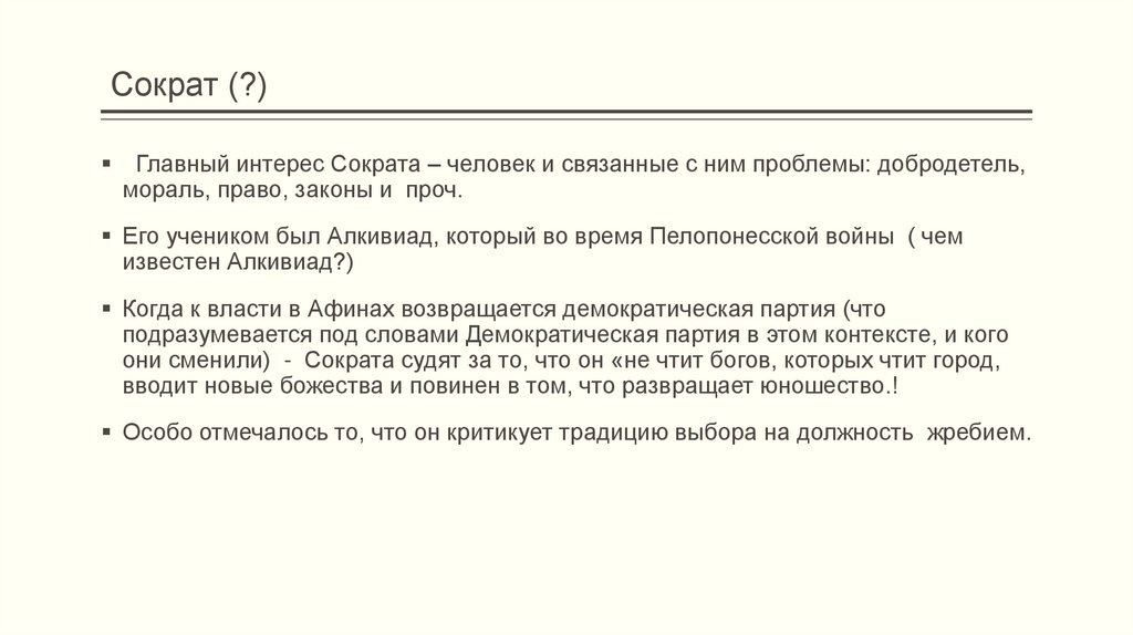 Сократ (?)Главный интерес Сократа – человек и связанные с ним проблемы: добродетель,