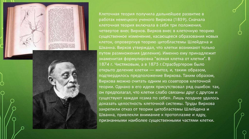 Клеточная теория получила дальнейшее развитие вработах немецкого ученого Вирхова (1859). Сначала