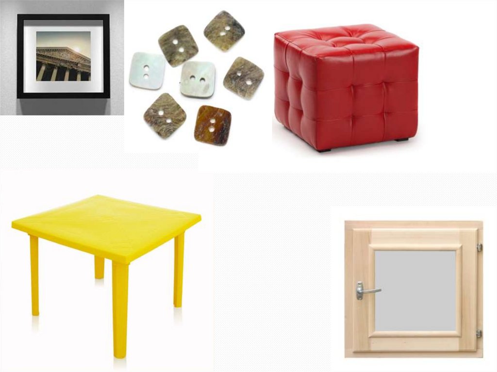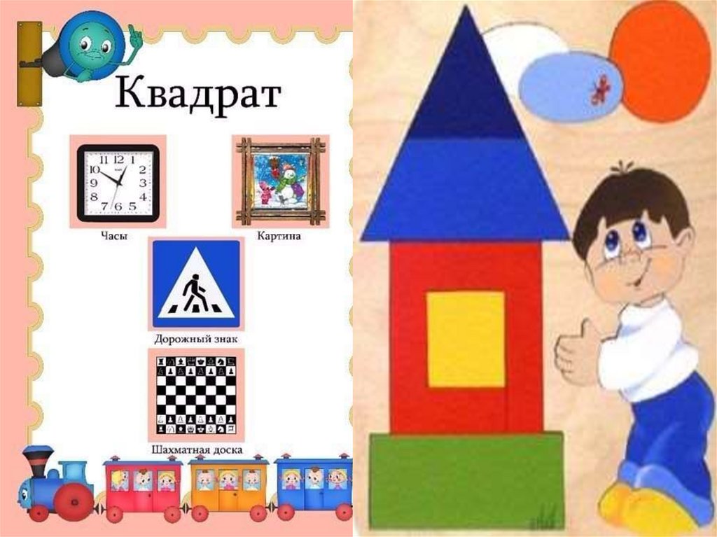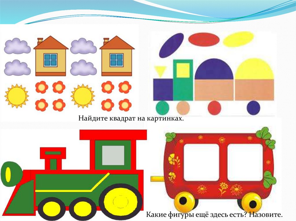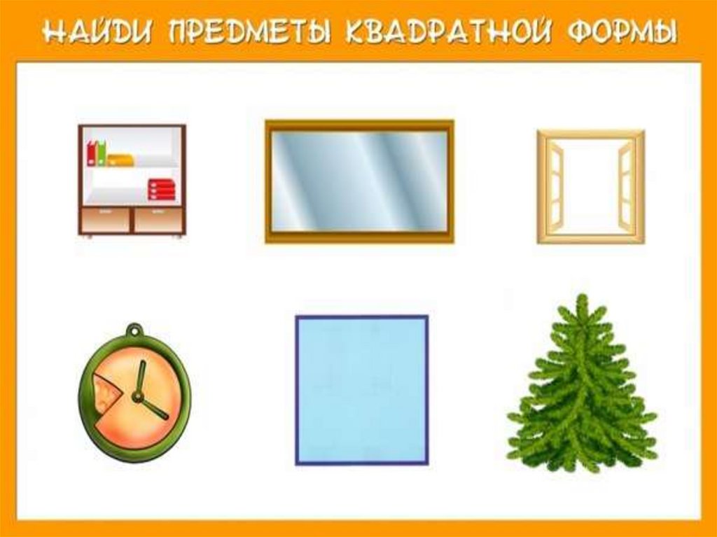 Найдите квадрат на картинках.Какие фигуры ещё здесь есть? Назовите.