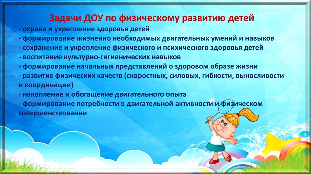 Задачи ДОУ по физическому развитию детей- охрана и укрепление здоровья детей