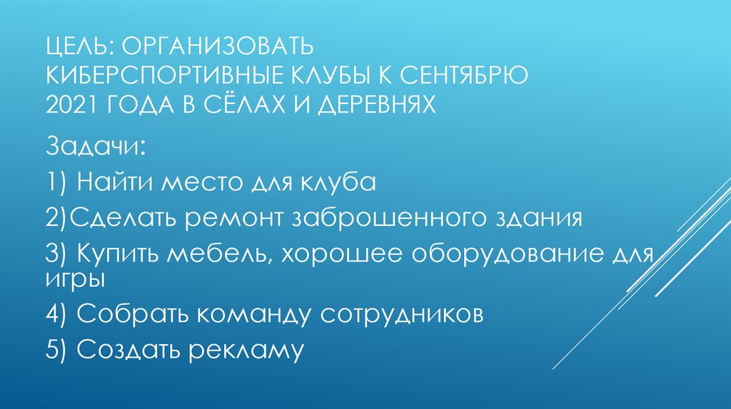 ЦЕЛЬ: ОРГАНИЗОВАТЬКИБЕРСПОРТИВНЫЕ КЛУБЫ К СЕНТЯБРЮ