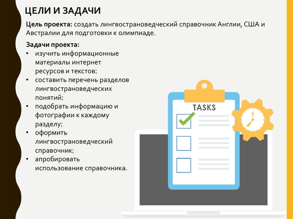 ЦЕЛИ И ЗАДАЧИЦель проекта: создать лингвострановедческий справочник Англии, США и