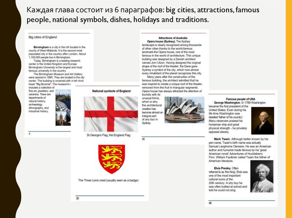 Каждая глава состоит из 6 параграфов: big cities, attractions, famouspeople, national symbols, dishes, holidays and traditions.