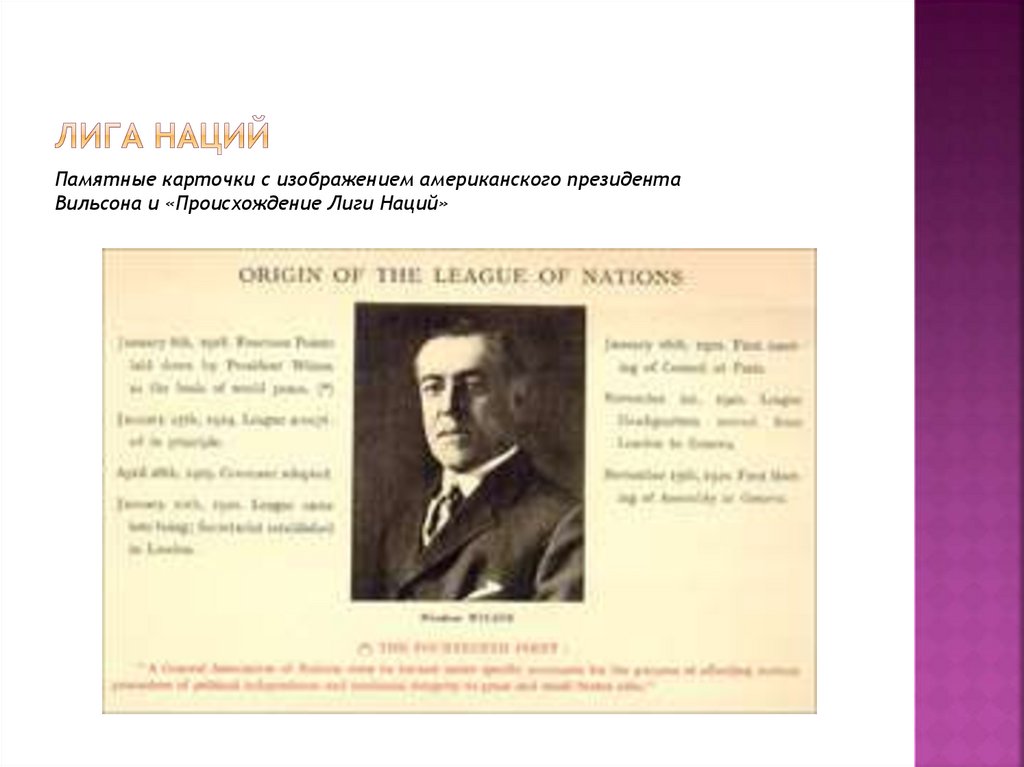 Памятные карточки с изображением американского президентаВильсона и «Происхождение Лиги Наций»