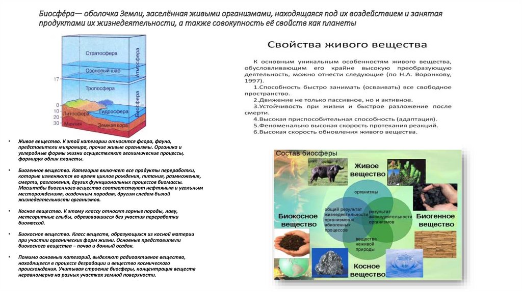 Биосфе́ра— оболочка Земли, заселённая живыми организмами, находящаяся под их воздействием и занятаяпродуктами их жизнедеятельности, а также совокупность её свойств как планеты