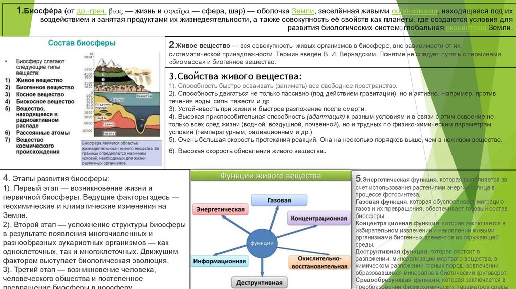 1.Биосфе́ра (от др.-греч. βιος — жизнь и σφαῖρα — сфера, шар) — оболочка Земли, заселённая живыми организмами, находящаяся под ихвоздействием и занятая продуктами их жизнедеятельности, а также совокупность её свойств как планеты, где создаются условия для