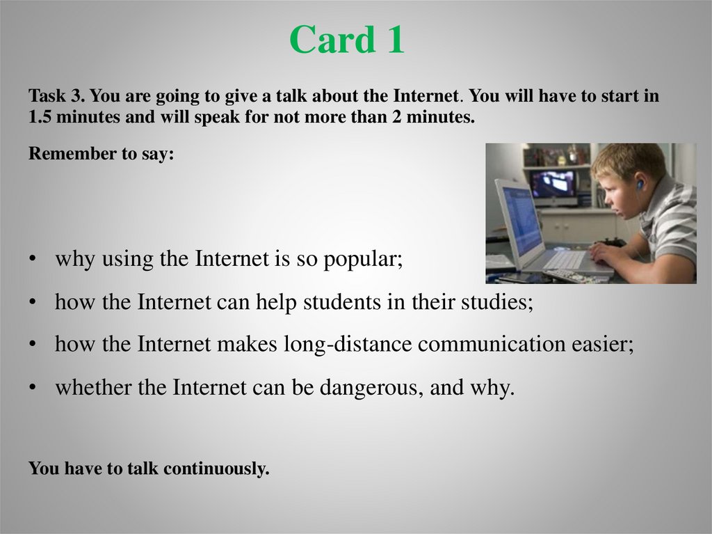 Card 1Task 3. You are going to give a talk about the Internet. You will have to start in