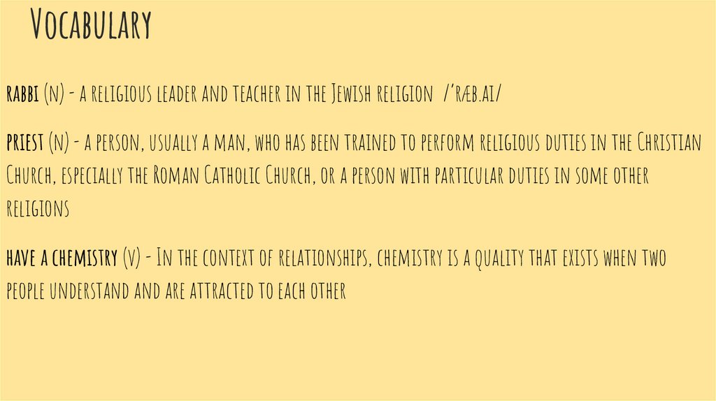 Vocabularyrabbi (n) - a religious leader and teacher in the Jewish religion /’ræb.ai/