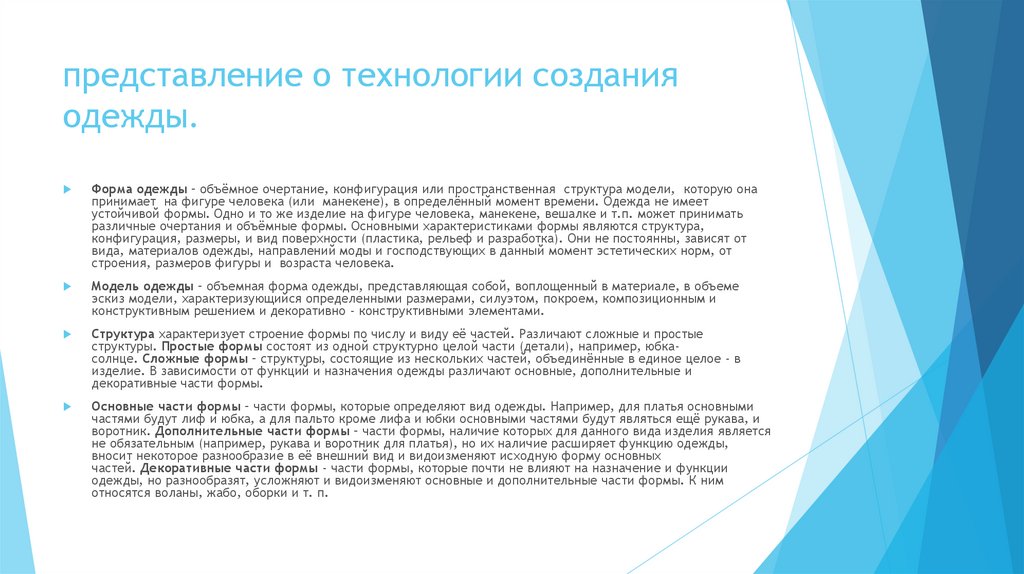 Основные части формы – части формы, которые определяют вид одежды. Например, для платья основными