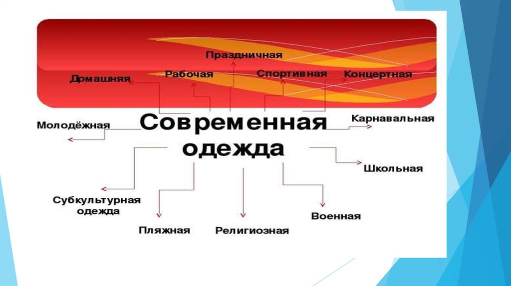 изделие. В зависимости от функций и назначения одежды различают основные, дополнительные и