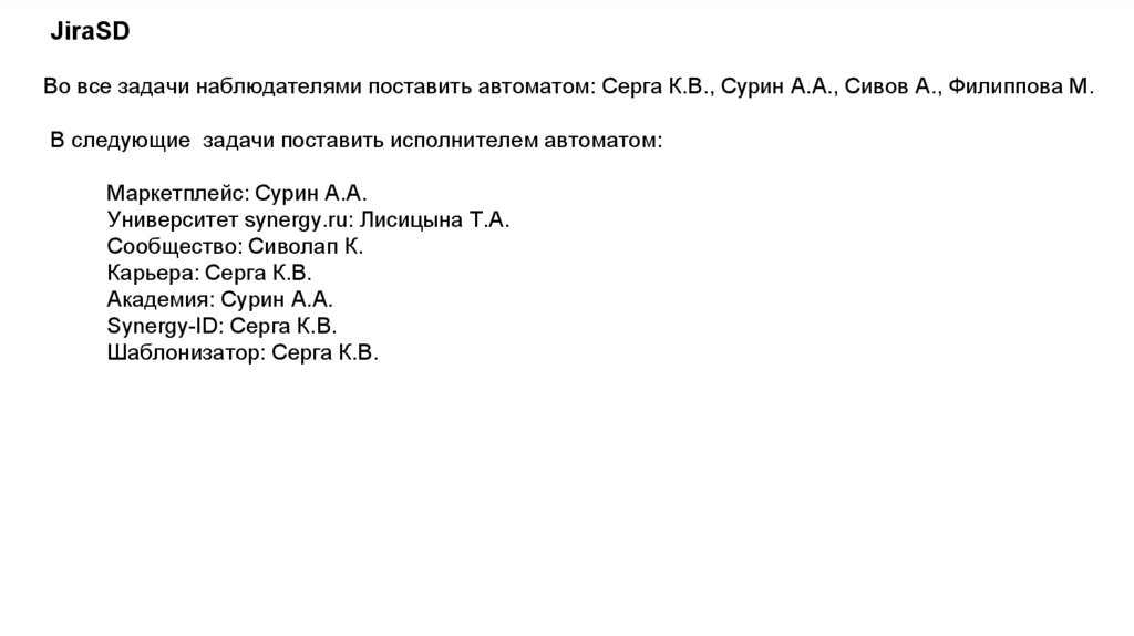 JiraSDВо все задачи наблюдателями поставить автоматом: Серга К.В., Сурин А.А., Сивов А., Филиппова М.