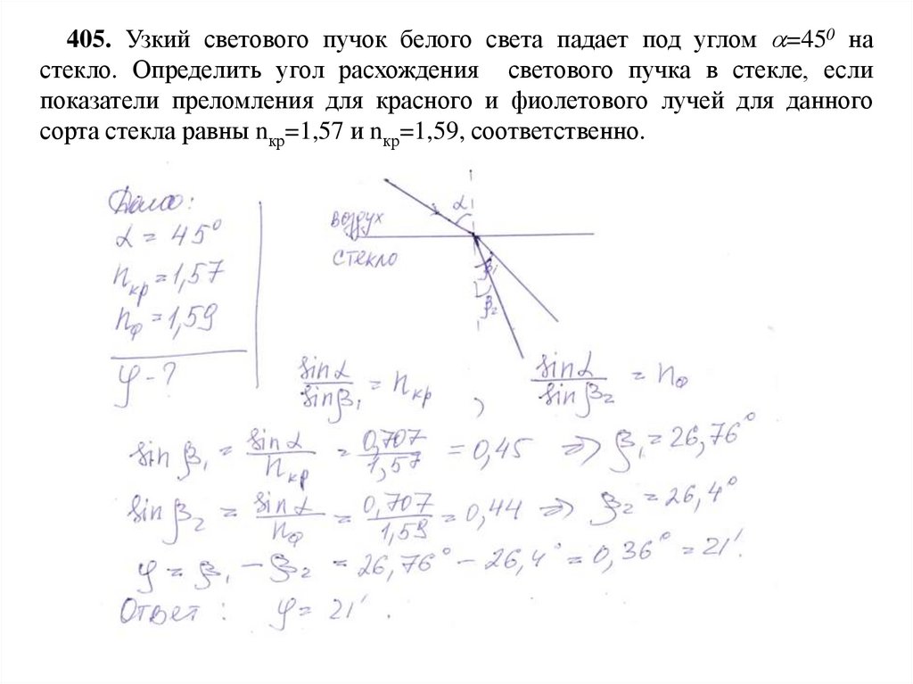 405. Узкий светового пучок белого света падает под углом =450 настекло. Определить угол расхождения светового пучка в стекле, если