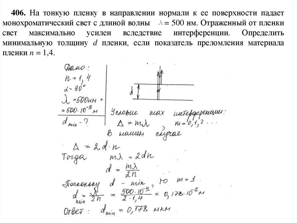 406. На тонкую пленку в направлении нормали к ее поверхности падаетмонохроматический свет с длиной волны λ = 500 нм. Отраженный от пленки
