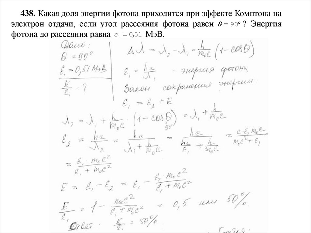 438. Какая доля энергии фотона приходится при эффекте Комптона наэлектрон отдачи, если угол рассеяния фотона равен 90 ? Энергия