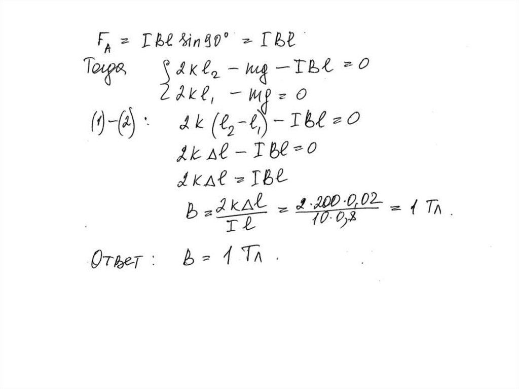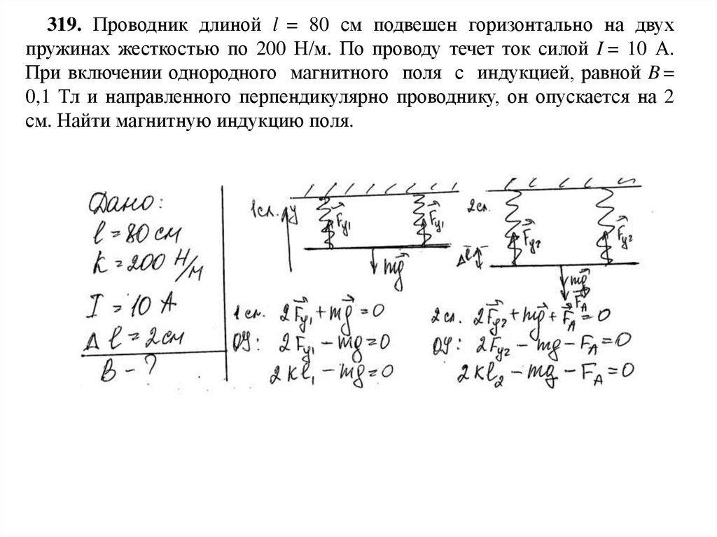 319. Проводник длиной l = 80 см подвешен горизонтально на двухпружинах жесткостью по 200 Н/м. По проводу течет ток силой I = 10 А.