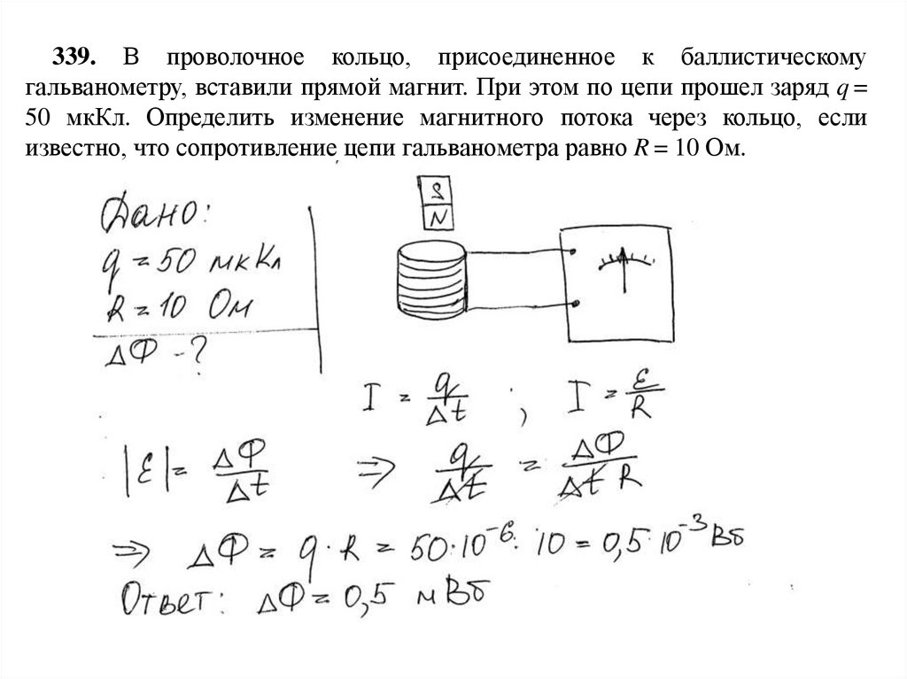 339. В проволочное кольцо, присоединенное к баллистическомугальванометру, вставили прямой магнит. При этом по цепи прошел заряд q =