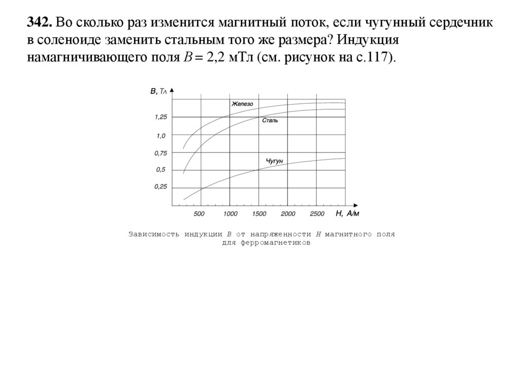 342. Во сколько раз изменится магнитный поток, если чугунный сердечникв соленоиде заменить стальным того же размера? Индукция