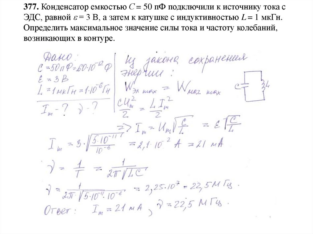 377. Конденсатор емкостью С = 50 пФ подключили к источнику тока сЭДС, равной = 3 В, а затем к катушке с индуктивностью L = 1 мкГн.
