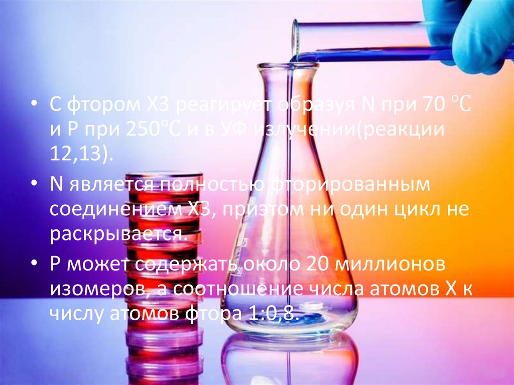• C фтором X3 реагирует образуя N при 70 ℃и P при 250℃ и в УФ излучении(реакции