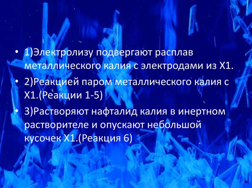 • 1)Электролизу подвергают расплавметаллического калия с электродами из X1.