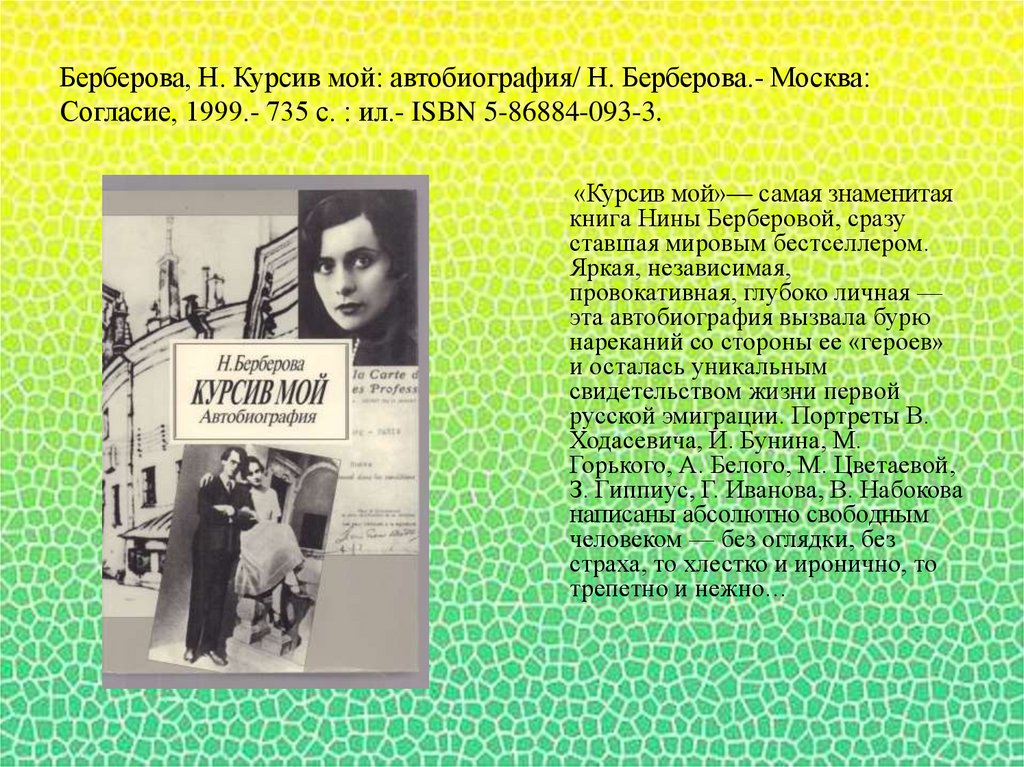 Берберова, Н. Курсив мой: автобиография/ Н. Берберова.- Москва:Согласие, 1999.- 735 с. : ил.- ISBN 5-86884-093-3.