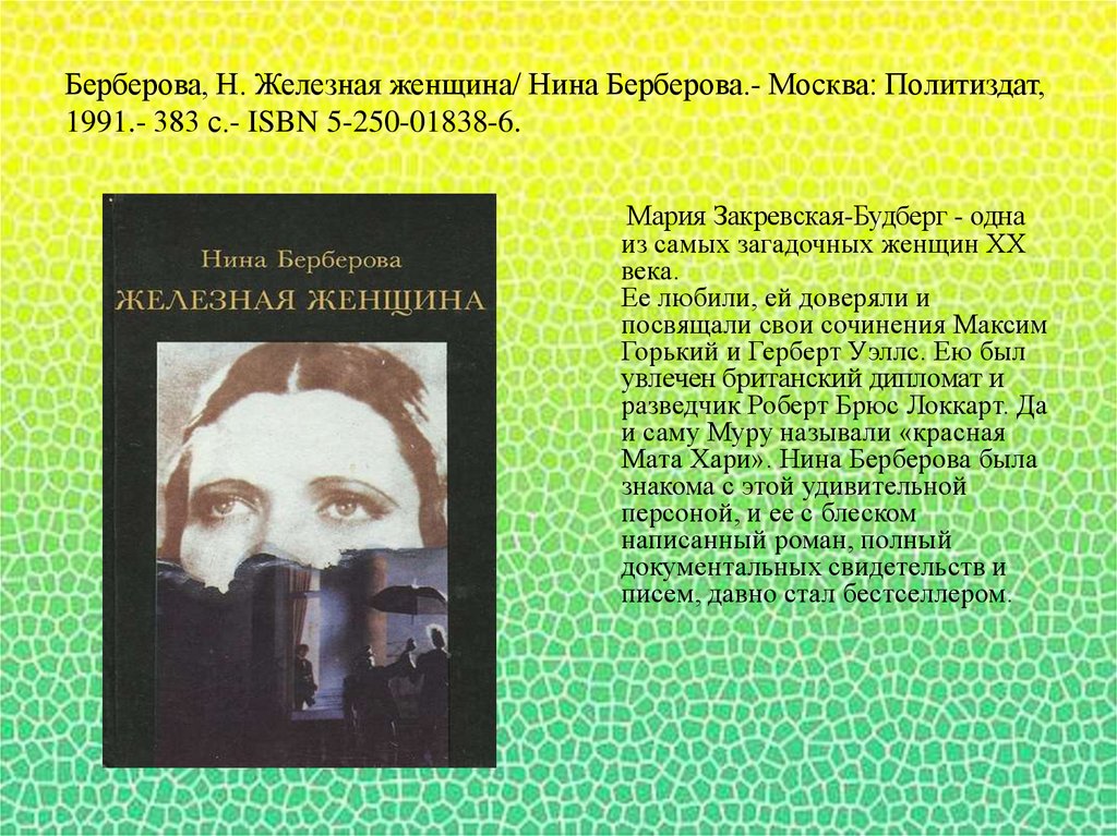 Берберова, Н. Железная женщина/ Нина Берберова.- Москва: Политиздат,1991.- 383 с.- ISBN 5-250-01838-6.
