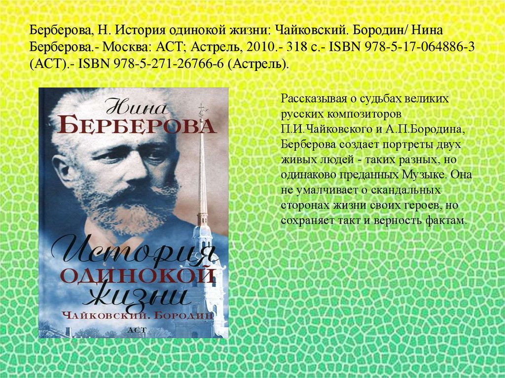 Берберова, Н. История одинокой жизни: Чайковский. Бородин/ НинаБерберова.- Москва: АСТ; Астрель, 2010.- 318 с.- ISBN 978-5-17-064886-3