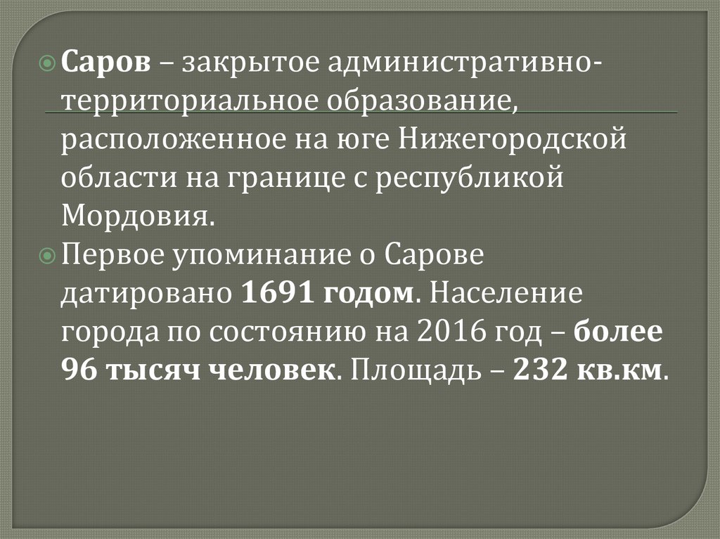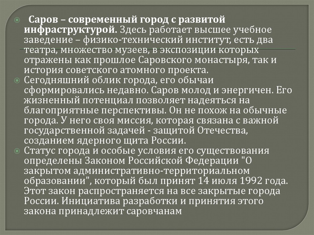 Саров – современный город с развитойинфраструктурой. Здесь работает высшее учебное