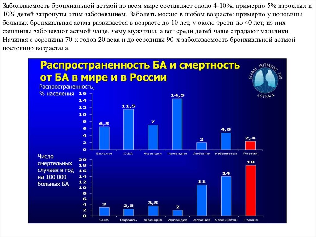 Заболеваемость бронхиальной астмой во всем мире составляет около 4-10%, примерно 5% взрослых и10% детей затронуты этим заболеванием. Заболеть можно в любом возрасте: примерно у половины