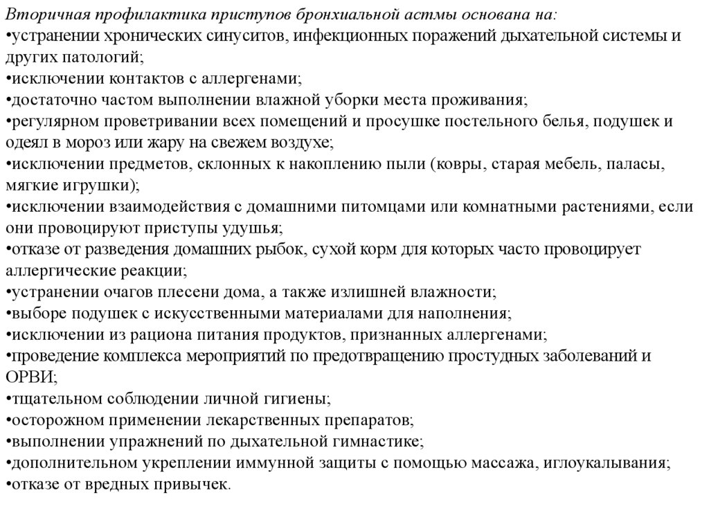 Вторичная профилактика приступов бронхиальной астмы основана на:•устранении хронических синуситов, инфекционных поражений дыхательной системы и