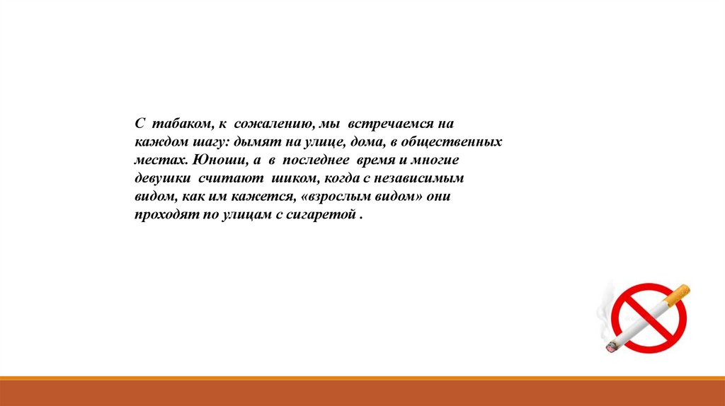 С табаком, к сожалению, мы встречаемся накаждом шагу: дымят на улице, дома, в общественных