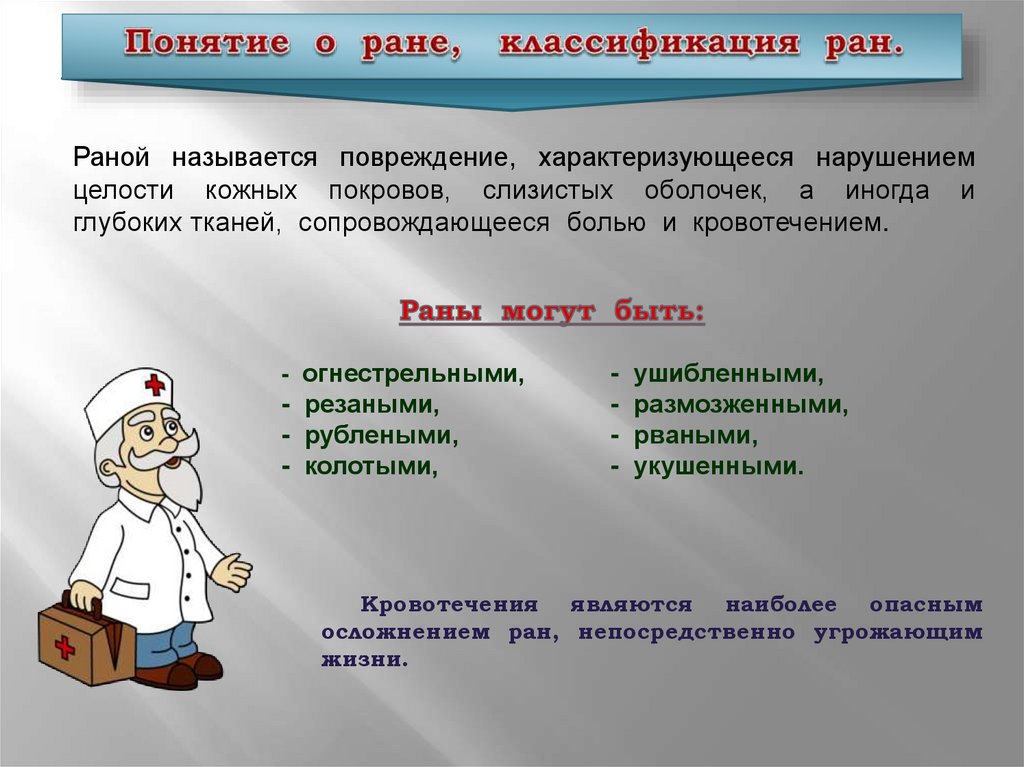 Понятие о ране. Виды кровотечений. Оказание помощи