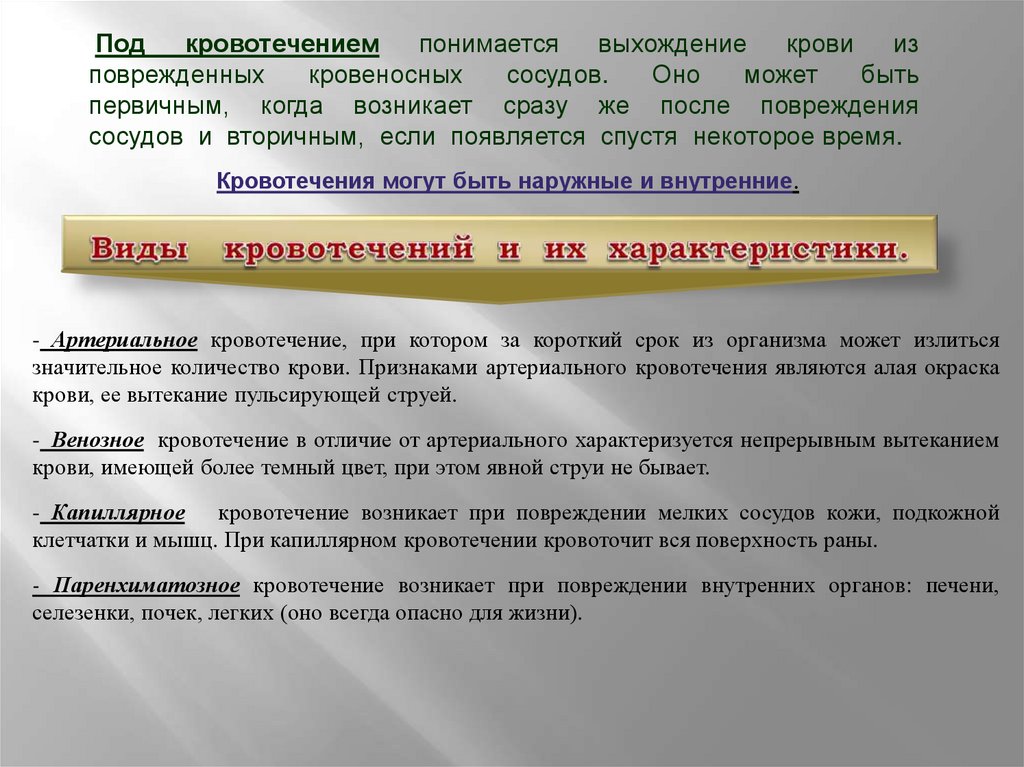 значительное количество крови. Признаками артериального кровотечения являются алая окраска