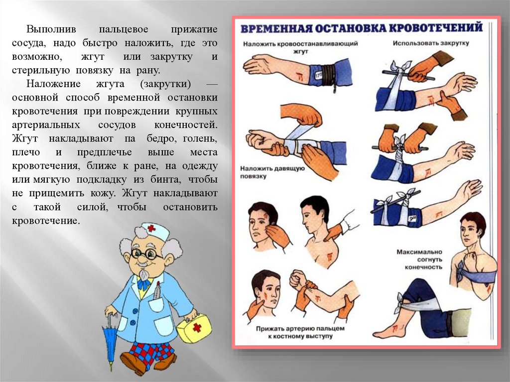 В зависимости от вида кровотечения (артериальное,венозное, капиллярное) осуществляется временная