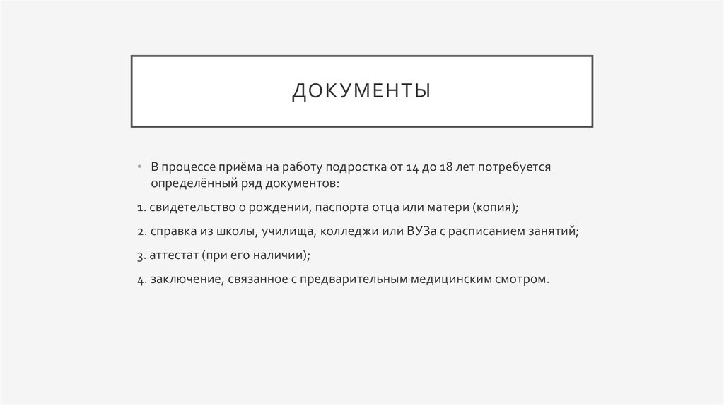 ДОКУМЕНТЫ• В процессе приёма на работу подростка от 14 до 18 лет потребуется