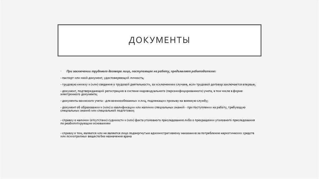 ДОКУМЕНТЫПри заключении трудового договора лицо, поступающее на работу, предъявляет работодателю: