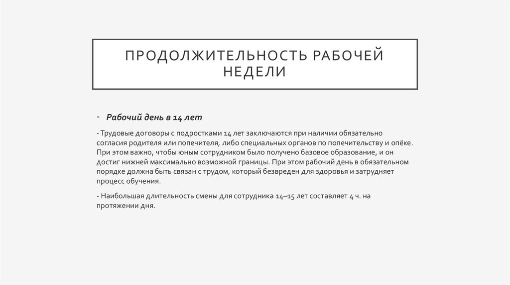 - Наибольшая длительность смены для сотрудника 14–15 лет составляет 4 ч. на