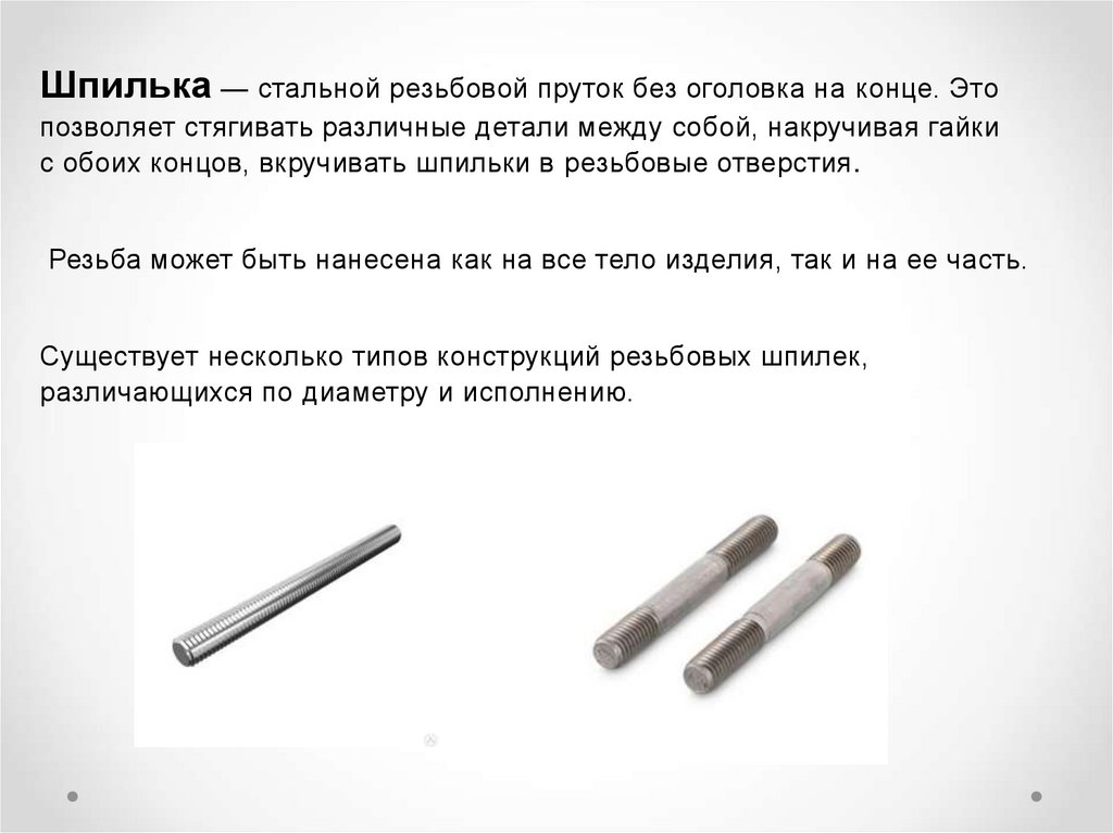 Шпилька — стальной резьбовой пруток без оголовка на конце. Этопозволяет стягивать различные детали между собой, накручивая гайки
