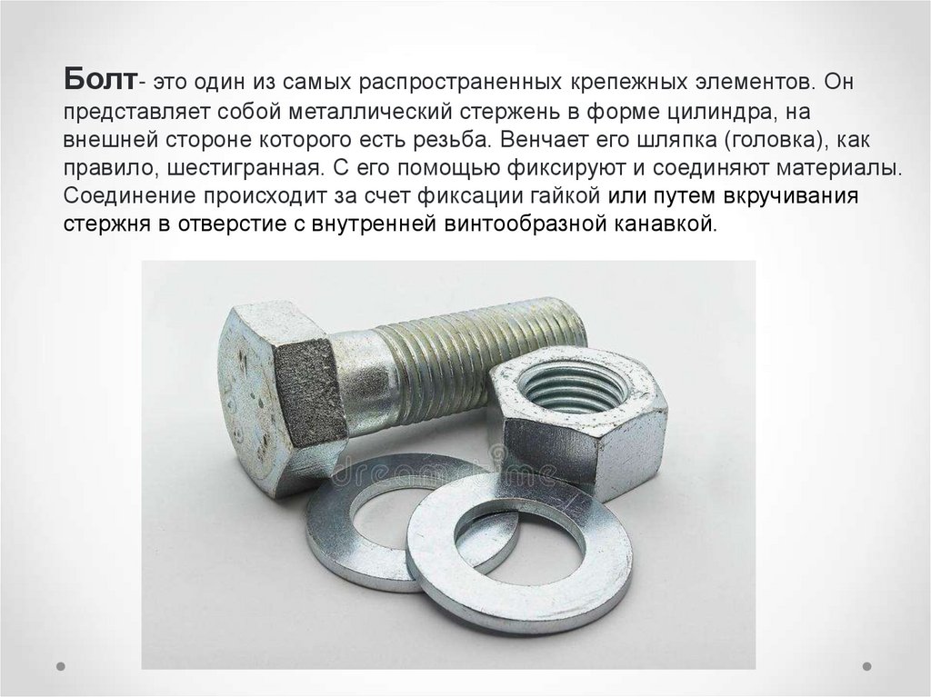Болт- это один из самых распространенных крепежных элементов. Онпредставляет собой металлический стержень в форме цилиндра, на