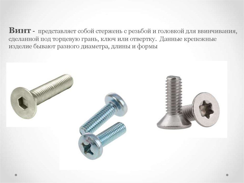 Винт -представляет собой стержень с резьбой и головкой для ввинчивания,