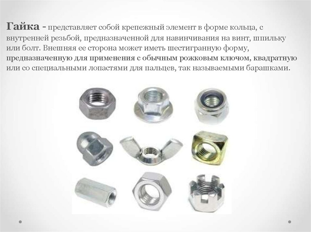 Гайка - представляет собой крепежный элемент в форме кольца, свнутренней резьбой, предназначенной для навинчивания на винт, шпильку