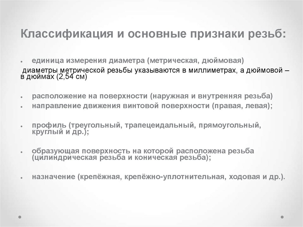 Классификация и основные признаки резьб:единица измерения диаметра (метрическая, дюймовая)