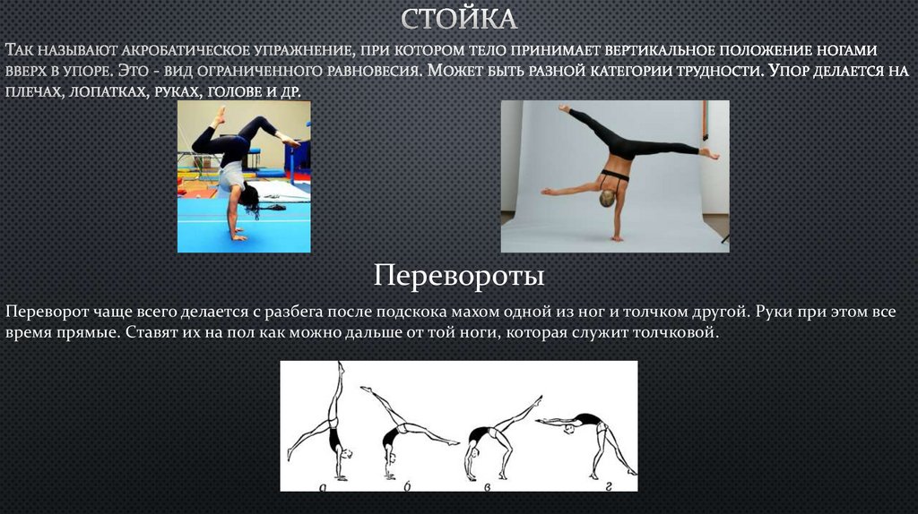 ПереворотыПереворот чаще всего делается с разбега после подскока махом одной из ног и толчком другой. Руки при этом все