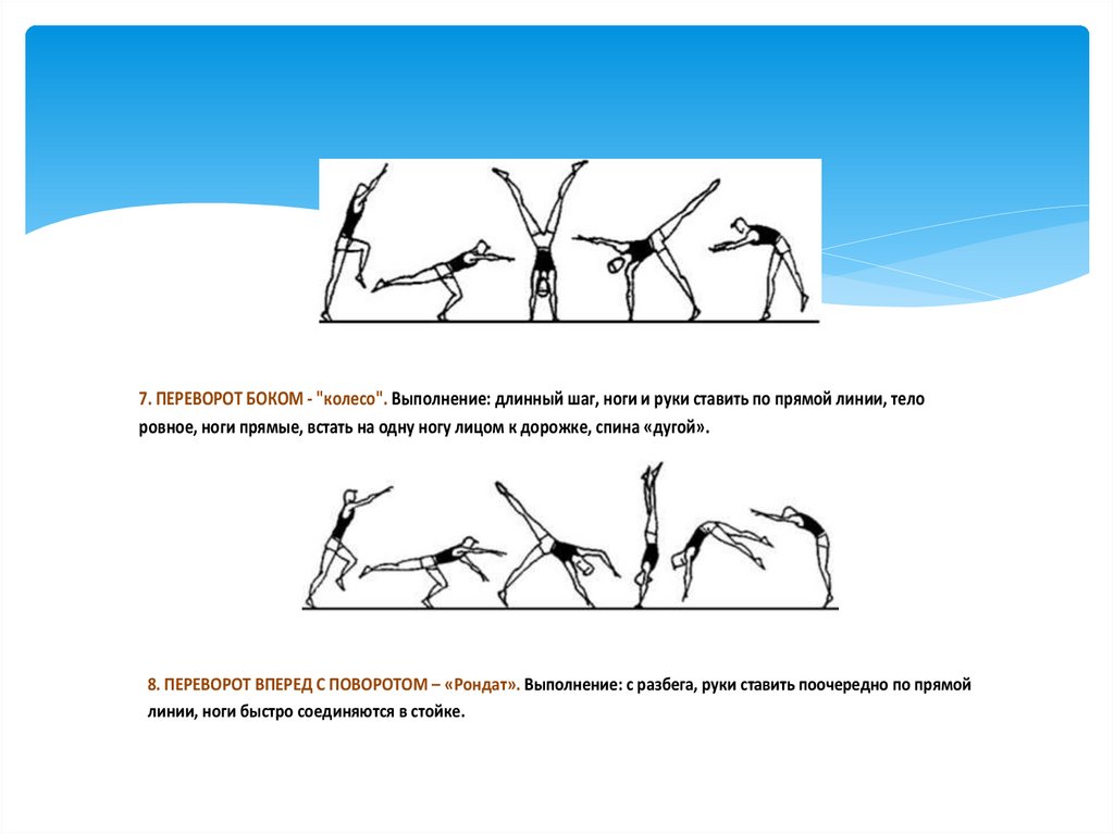 7. ПЕРЕВОРОТ БОКОМ - "колесо". Выполнение: длинный шаг, ноги и руки ставить по прямой линии, телоровное, ноги прямые, встать на одну ногу лицом к дорожке, спина «дугой».
