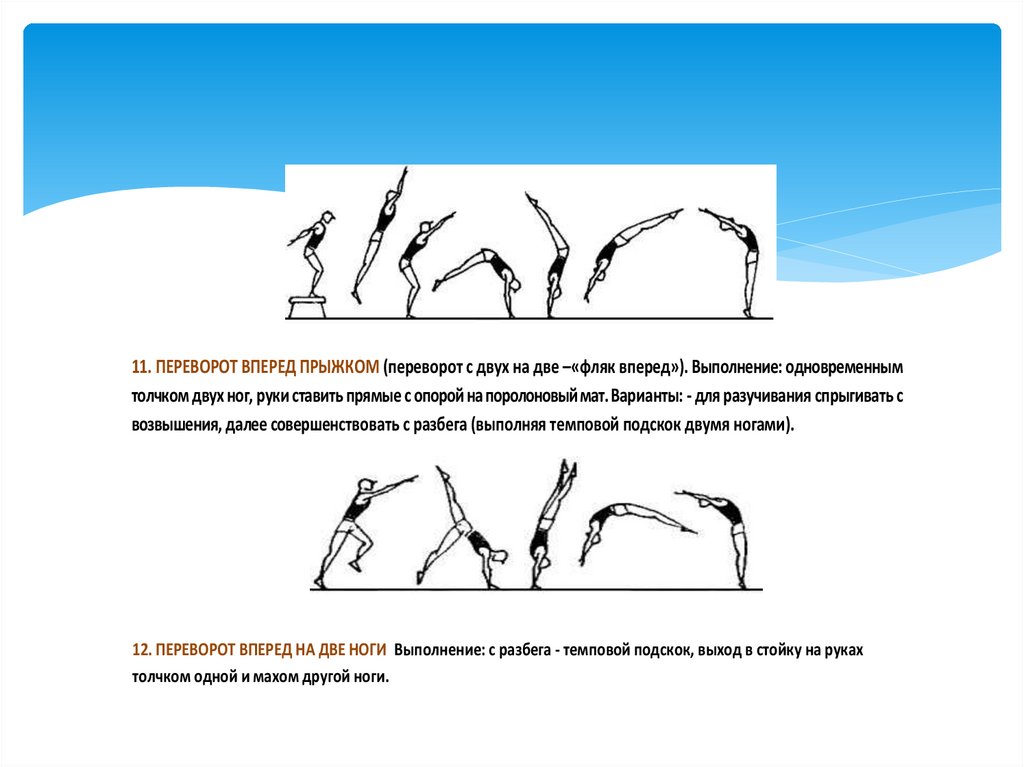 11. ПЕРЕВОРОТ ВПЕРЕД ПРЫЖКОМ (переворот с двух на две –«фляк вперед»). Выполнение: одновременнымтолчком двух ног, руки ставить прямые с опорой на поролоновый мат. Варианты: - для разучивания спрыгивать с
