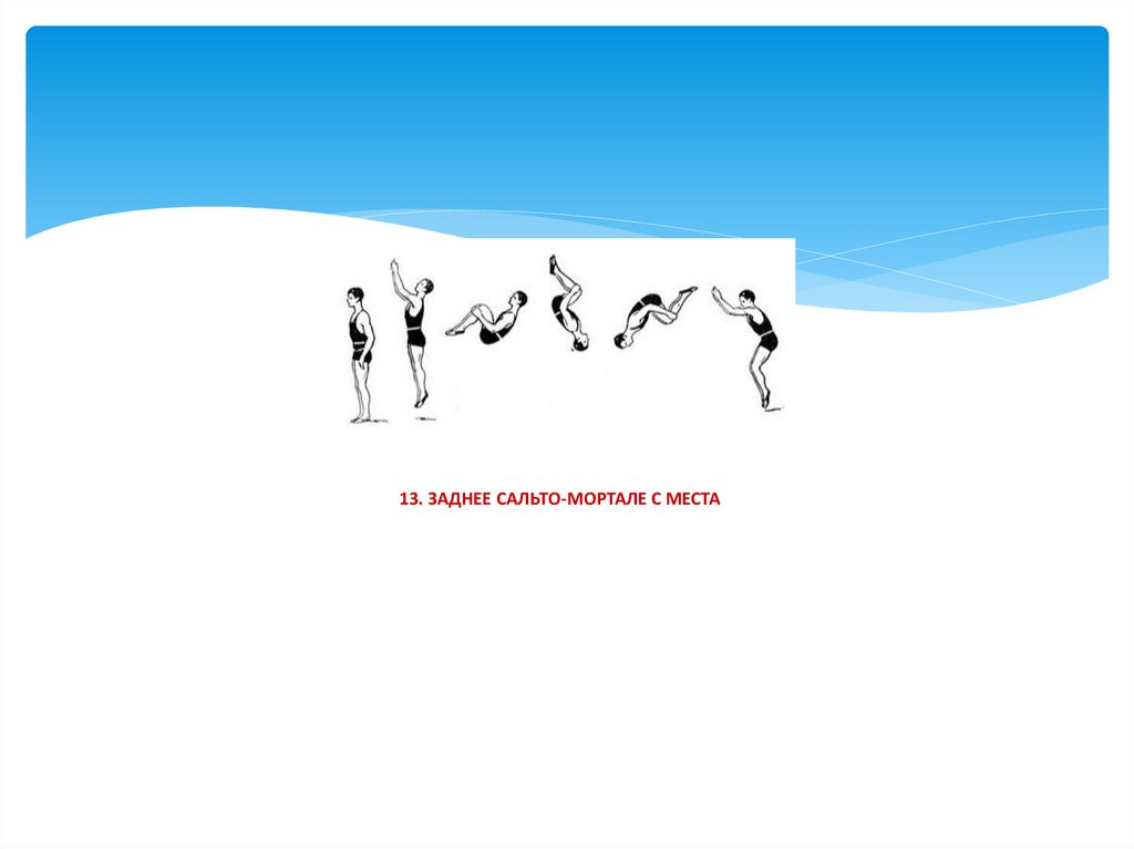 10. ПЕРЕВОРОТ НАЗАД – «фляк». Выполнение: с места, «рондата, мах прямыми руками с отталкиванием ног,