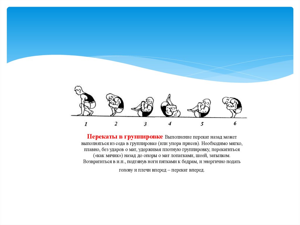 («как мячик») назад до опоры о мат лопатками, шеей, затылком.